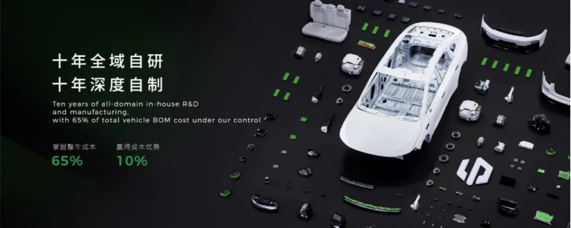 十年“板凳甘坐十年冷”的投入,这套体系结出了坚实的硕果:零跑实现了整车约65%核心部件的自研自造,这意味着从电池包(除电芯外购或合资)、电驱系统、电子电气架构、智能座舱、辅助驾驶系统,到近年拓展的座椅、车灯、保险杠等高附加值部件,零跑构建了从设计、研发到制造的全链条能力。